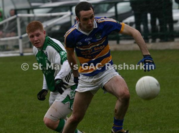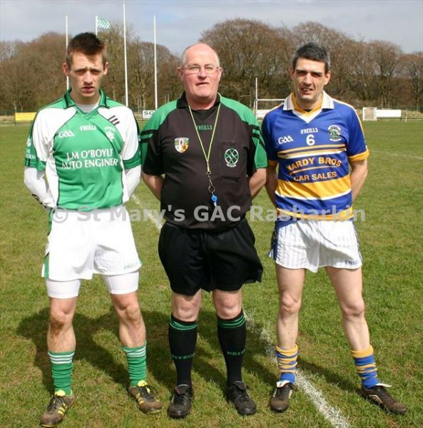 Con Magees Glenravel hosted near neighbours St.Mary’s Rasharkin in round three of the All County Football League Division Two on Sunday past. The visitors got away to the brightest start and lead by two after five minutes; however, the St.Mary’s men hit a barron phase midway through the first period and seemed to have left their shooting boots at Dreen. Meanwhile the homeside chipped away and found themselves in front after twenty minutes with fine points from Conor McNeill and Declan Traynor (2). Ryan Lynch levelled matters for Rasharkin, but Traynor almost immediately restored the lead for the green and white men a minute later.