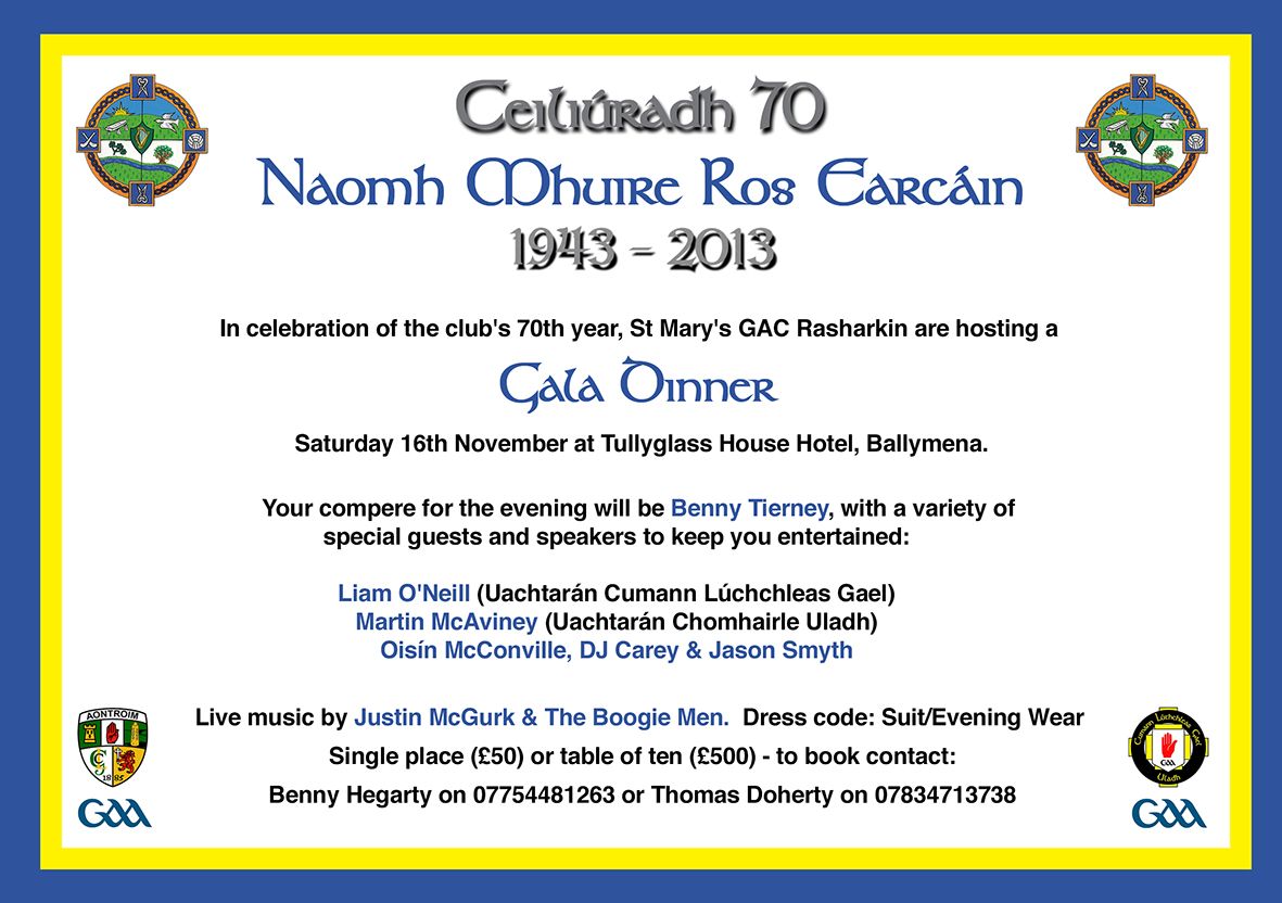 Our innovative events committee are currently working hard behind the scenes organising the clubs next big night. To mark our 70th year, St.Mary's GAC are hosting a Gala Dinner at Tullyglass House Hotel on Saturday 16th November.