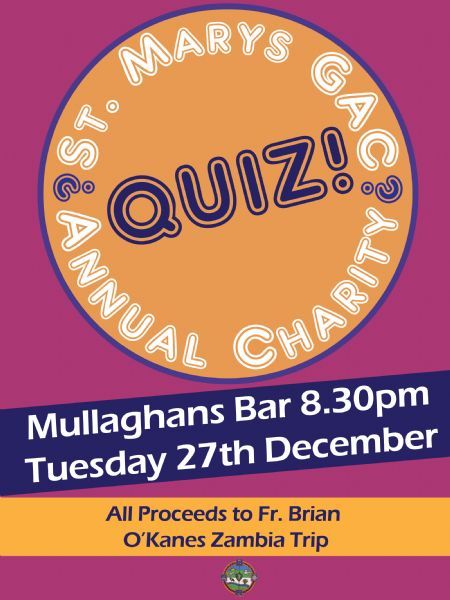 Our Annual Charity Quiz will take place this year on Tuesday 27th December in Mullaghans Bar at 8.30pm.