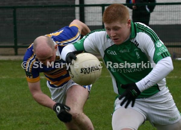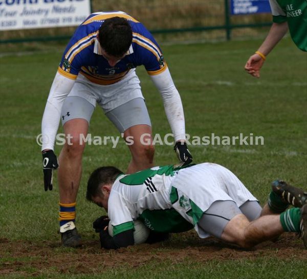 Con Magees Glenravel hosted near neighbours St.Mary’s Rasharkin in round three of the All County Football League Division Two on Sunday past. The visitors got away to the brightest start and lead by two after five minutes; however, the St.Mary’s men hit a barron phase midway through the first period and seemed to have left their shooting boots at Dreen. Meanwhile the homeside chipped away and found themselves in front after twenty minutes with fine points from Conor McNeill and Declan Traynor (2). Ryan Lynch levelled matters for Rasharkin, but Traynor almost immediately restored the lead for the green and white men a minute later.