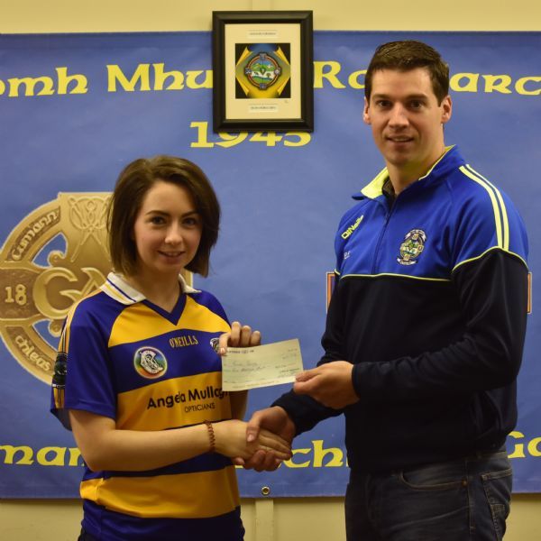 Our Senior Camogie player Eimear Quigg recently won our £5000 Club Lotto Jackpot. Eimear is pictured receiving her winnings from St. Marys Assistant Treasurer Brendan Etherson.