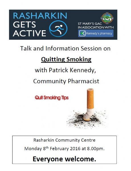 As part of the St. Mary's GAC Rasharkin Gets Active Event, which is being ran in association with Kennedy's Pharmacy, Patrick Kennedy from Kennedy's Pharmacy will be giving a talk & information session on Quitting Smoking next Monday night at 8.00pm in Rasharkin Community Centre.
